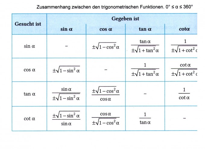 Sinus Cosinus Tangens Cotangens Tabelle