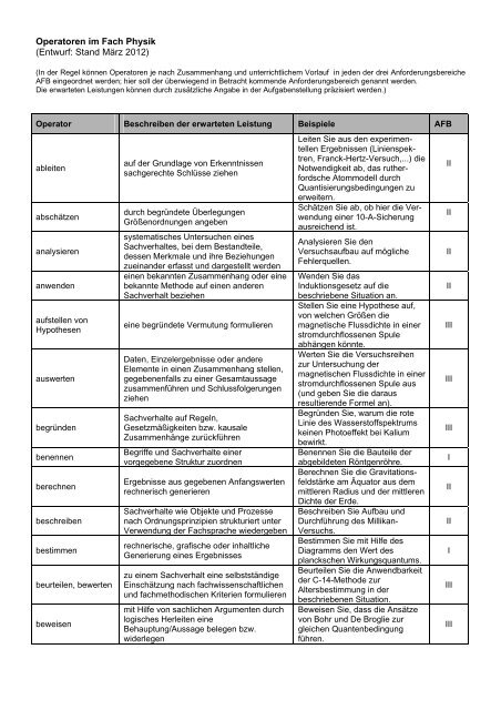 Operatoren fuer die naturwissenschaftlichen Faecher Physik Biologie Chemiean den Deutschen Schulen im Ausland Stand Februar 2013 In der Regel koennen Operatoren je nach Zusammenhang und unterrichtlichem Vorlauf in jeden der drei Anforderungsbereiche AFB eingeordnet werden. Beispiel fuer einen schulinternen Lehrplan Biologie WORD 452 KB. Primaer werden sie in Pruefungen Klausuren und Leistungskontrollen eingesetzt zu deren Vorbereitung als Arbeitsauftraege auch im gesamten Unterricht.