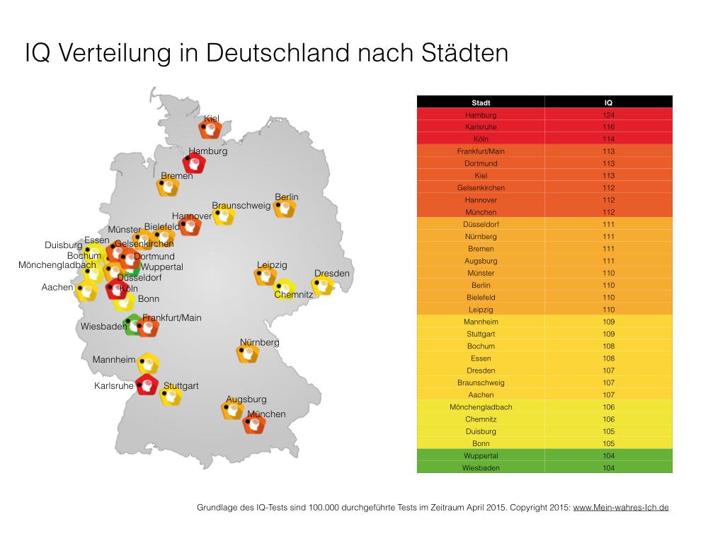 Daran orientieren sich Psychologen wenn sie Intelligenztests entwickeln. Mit einem durchschnittlichen IQ von 100 Punkten steht Deutschland in diesem Ranking auf Platz 15. Alle IQ-Werte unter 70 werden als bestimmte Schwachsinn oder niedrig eingestuft.