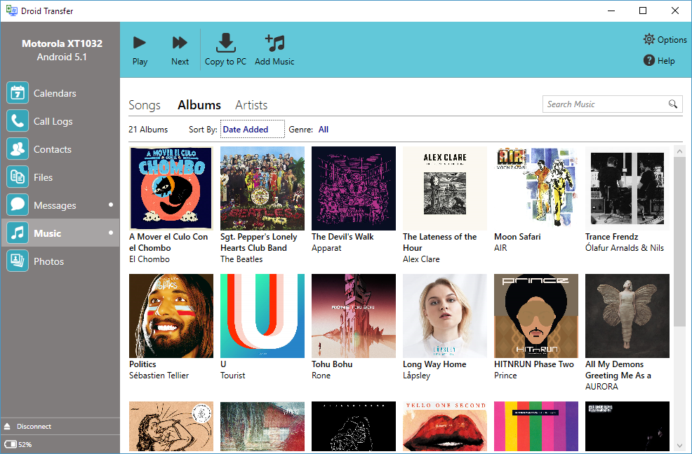Damit ist die Android Musikverwaltung sehr einfach. Unterstuetzt alle auch vom Geraet anerkannten Formate und bietet neben einer separaten Bass- und Treble-Anpassung. Droid Transfer verfuegt ueber eine umfangreiche moderne Benutzeroberflaeche mit der Sie muehelos die auf Ihrem Android-Geraet gespeicherte Musik durchsuchen und abspielen koennen.