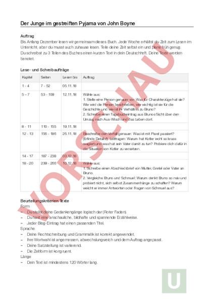 Der Junge im gestreiften Pyjama K Kapitel Ueberschrift Seiten Kurzinhalt Brunos Gefuehle Eigene Empfindungen Kernzitate Z Themenschwerpunkte TS 1 Bruno macht eine Entdeckung S. Bruno Sohn des Lagerkommandanten lebt mit seiner. Schmuel erzaehlt Bruno von seiner Familie seinem Leben als Jude in Polen und seiner Deportation ins Lager.